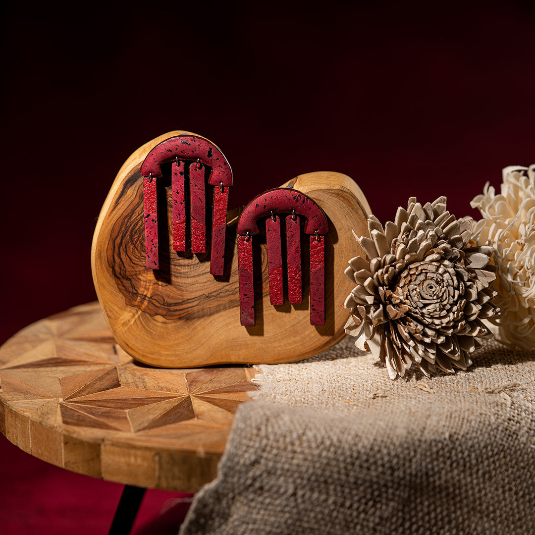 - The earrings are hand-cut in an arch shaped stud with pinatex and cork bars suspended below. The shape and colour of the piece makes it bold and statement.