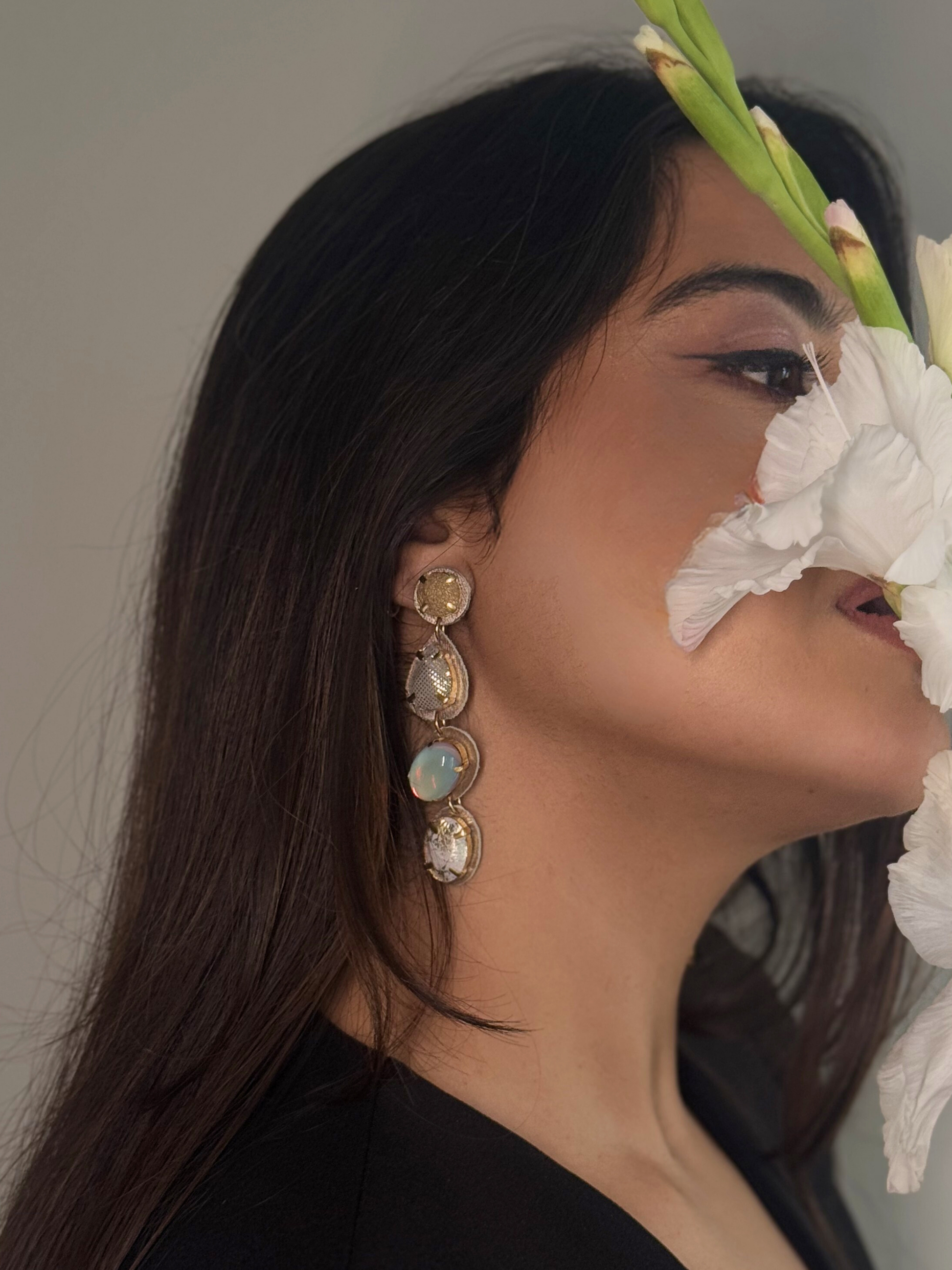Experience luxury and elegance with our Aurora Danglers. The iridescent stone, paired with metallic foiled leathers, creates a mesmerizing and versatile accessory. Perfect for adding a touch of understated elegance to any outfit. Elevate your style with these beautiful soft danglers.