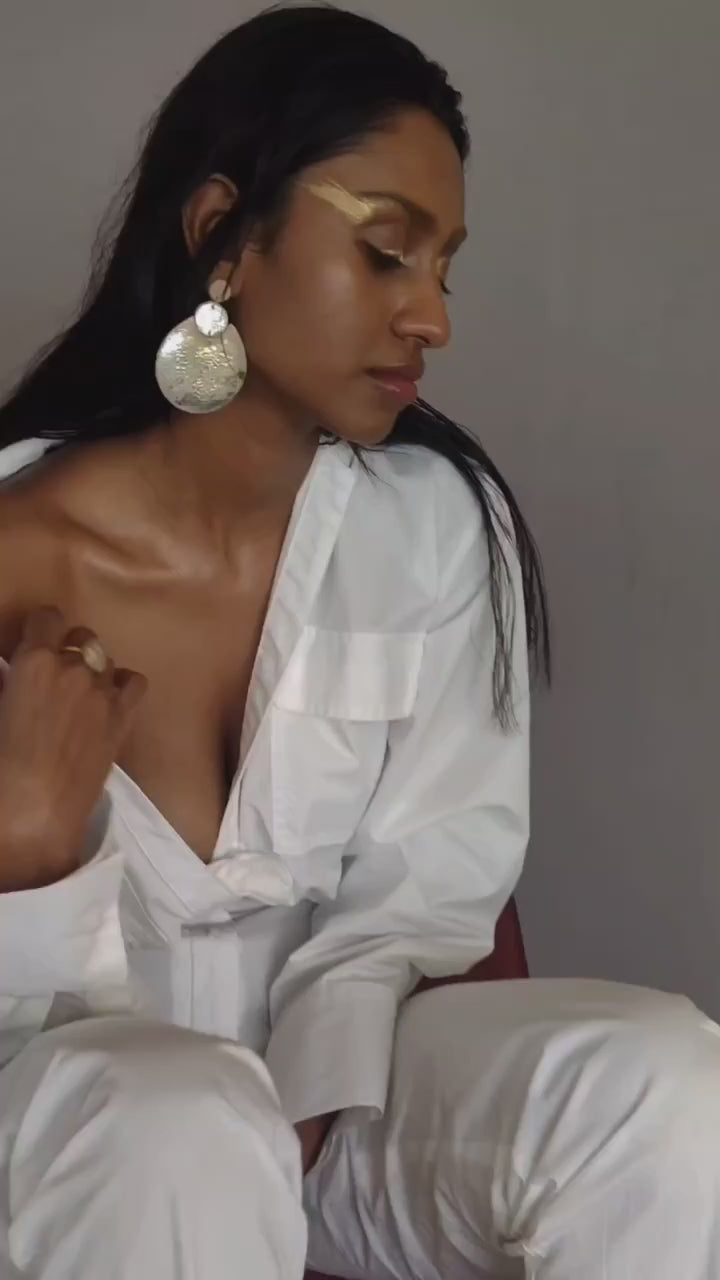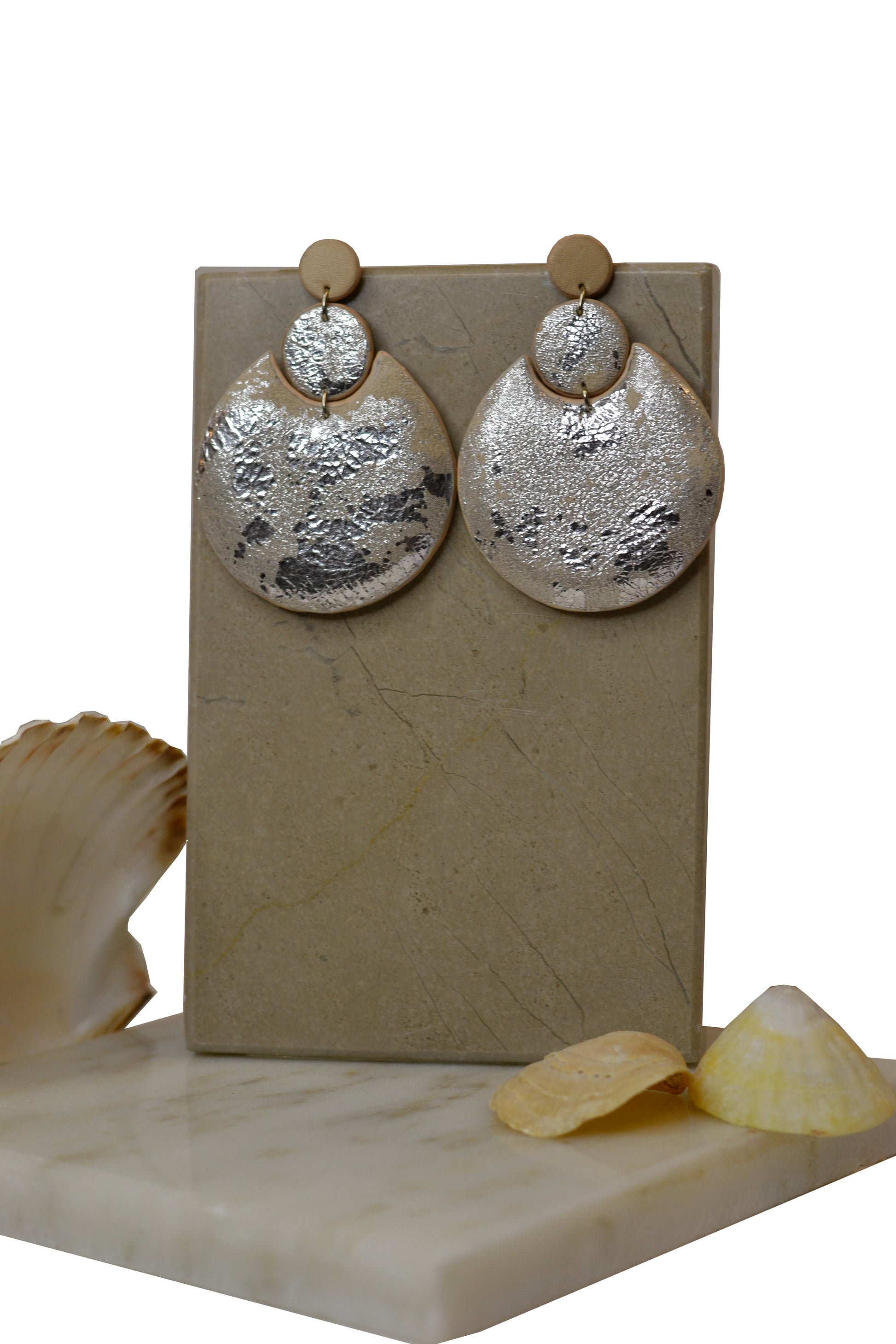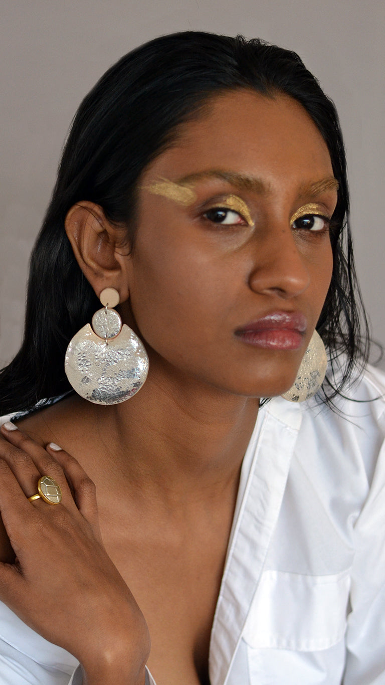 The crescent danglers are handcrafted in a patchy silver foil with beige leather and another in a flowvy black foil print on a soft black suede. The bold circles with the crescent shaped dangler makes it a perfect statement piece.
