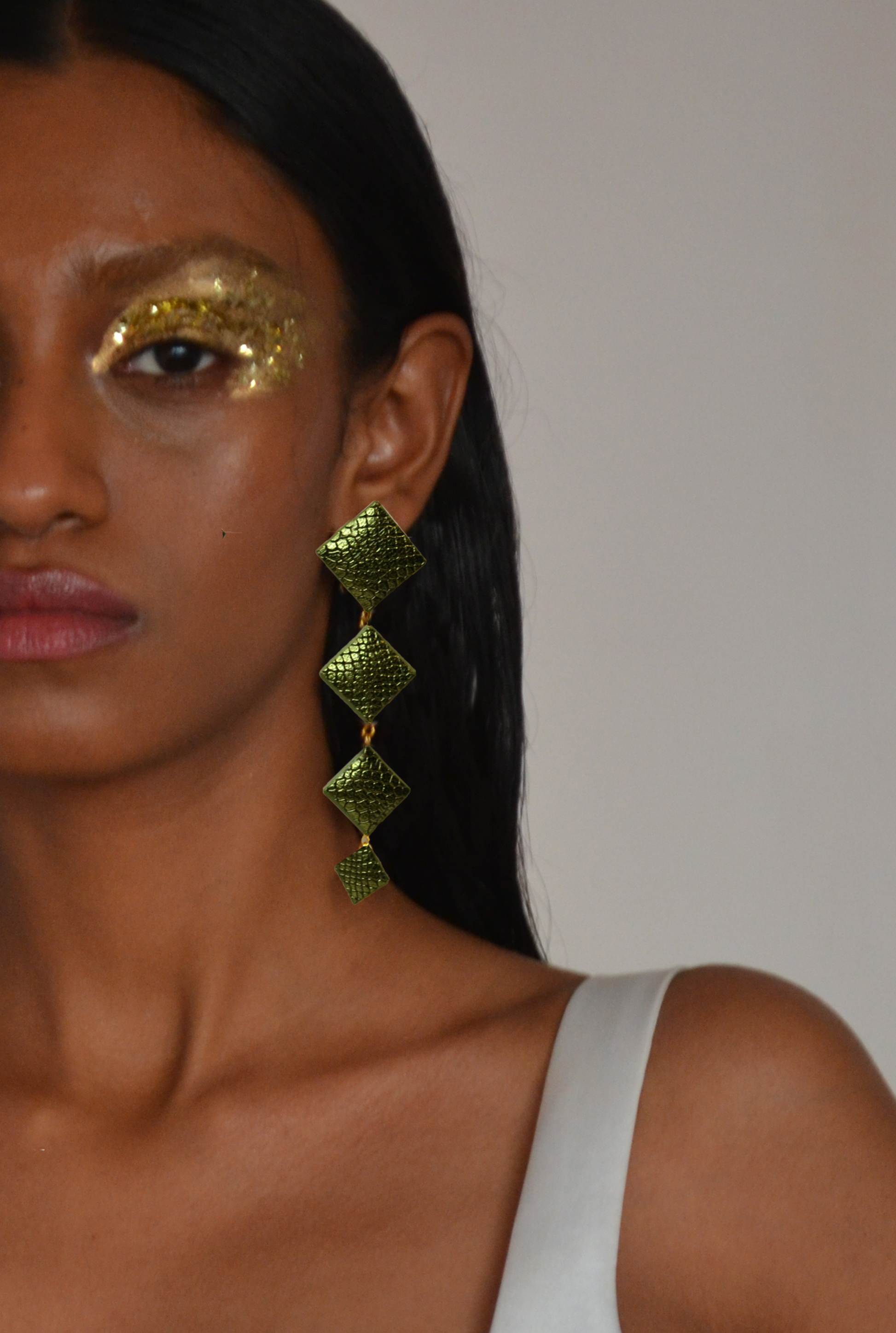 - The diamond danglers in a dusty gold suede and a bold green foil have a different look yet both are extremely versatile and lightweight.
