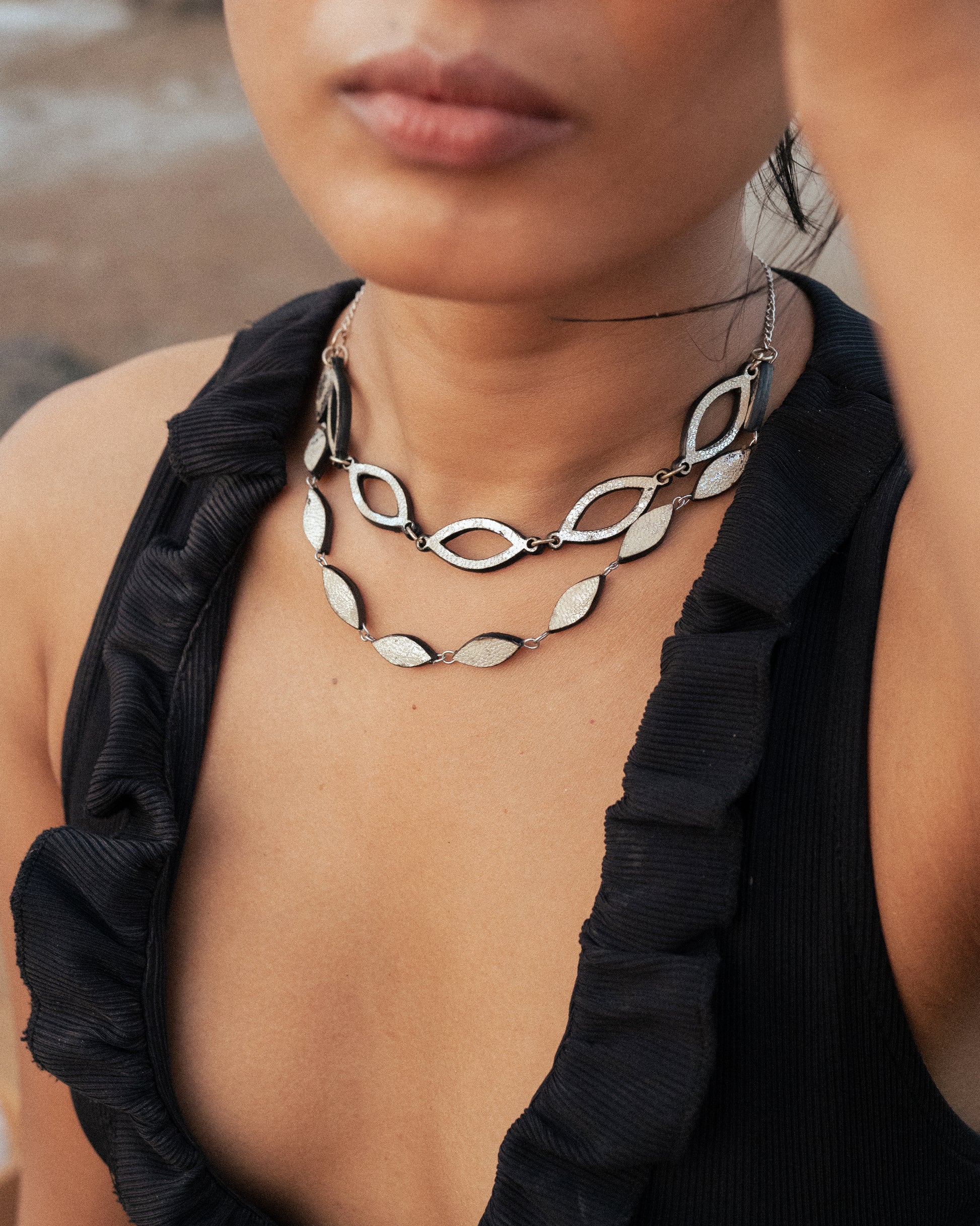 "Obsessed with your collections! Been dying to wear this handmade upcycled leather neckpiece ever since I bought it."
