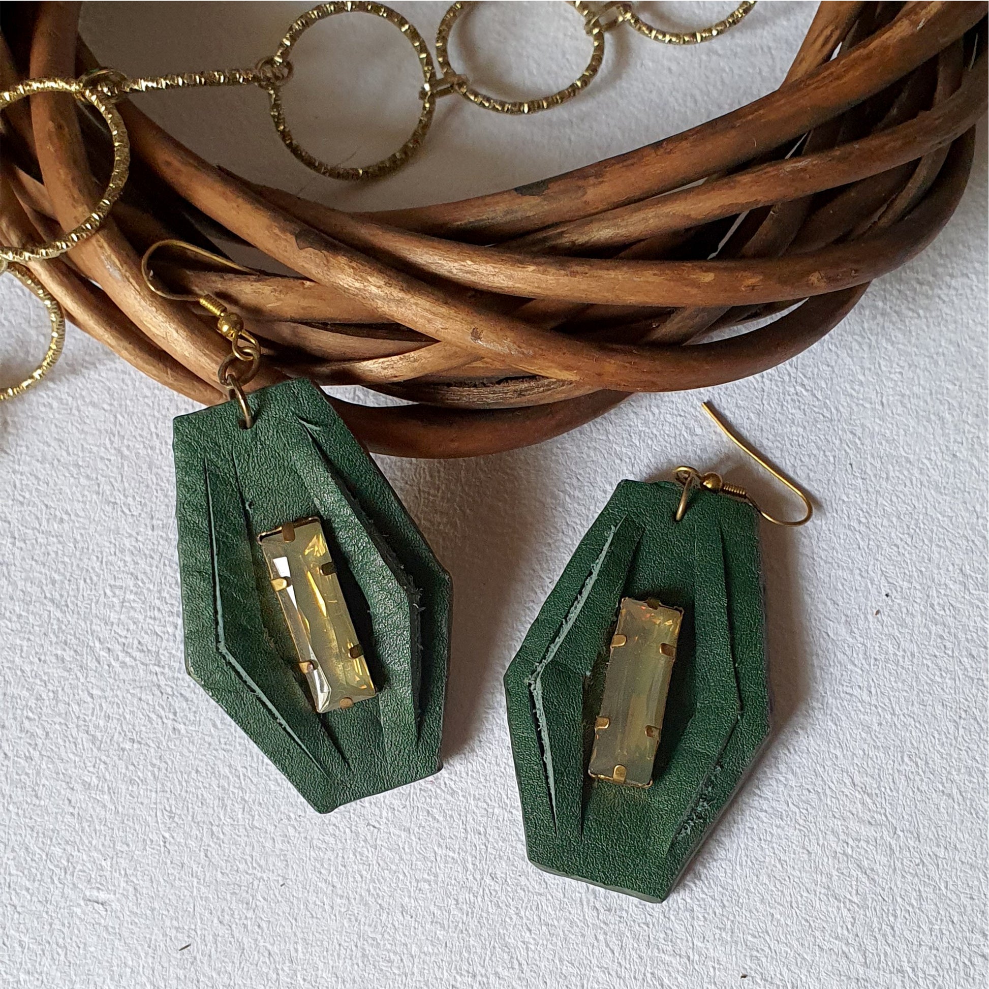 - A simple statement piece, the upcycled leather is handcut then folded, the stone is set in the centre which adds just the right amount of subtle bling to the piece!