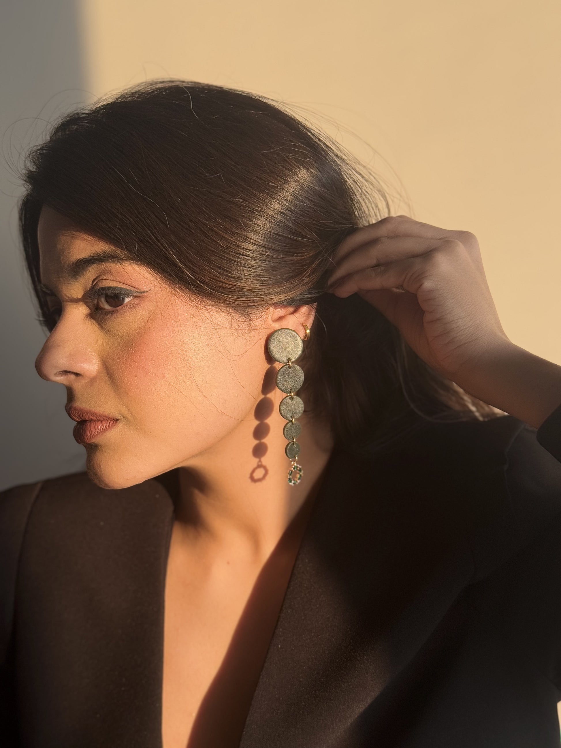 Indulge in luxury with our Stardust Danglers. These ethereal earrings feature a unique combination of silver and gold leather, adorned with stunning stones, placed asymmetrically for a one-of-a-kind look. Elevate any outfit with these exclusive statement pieces.