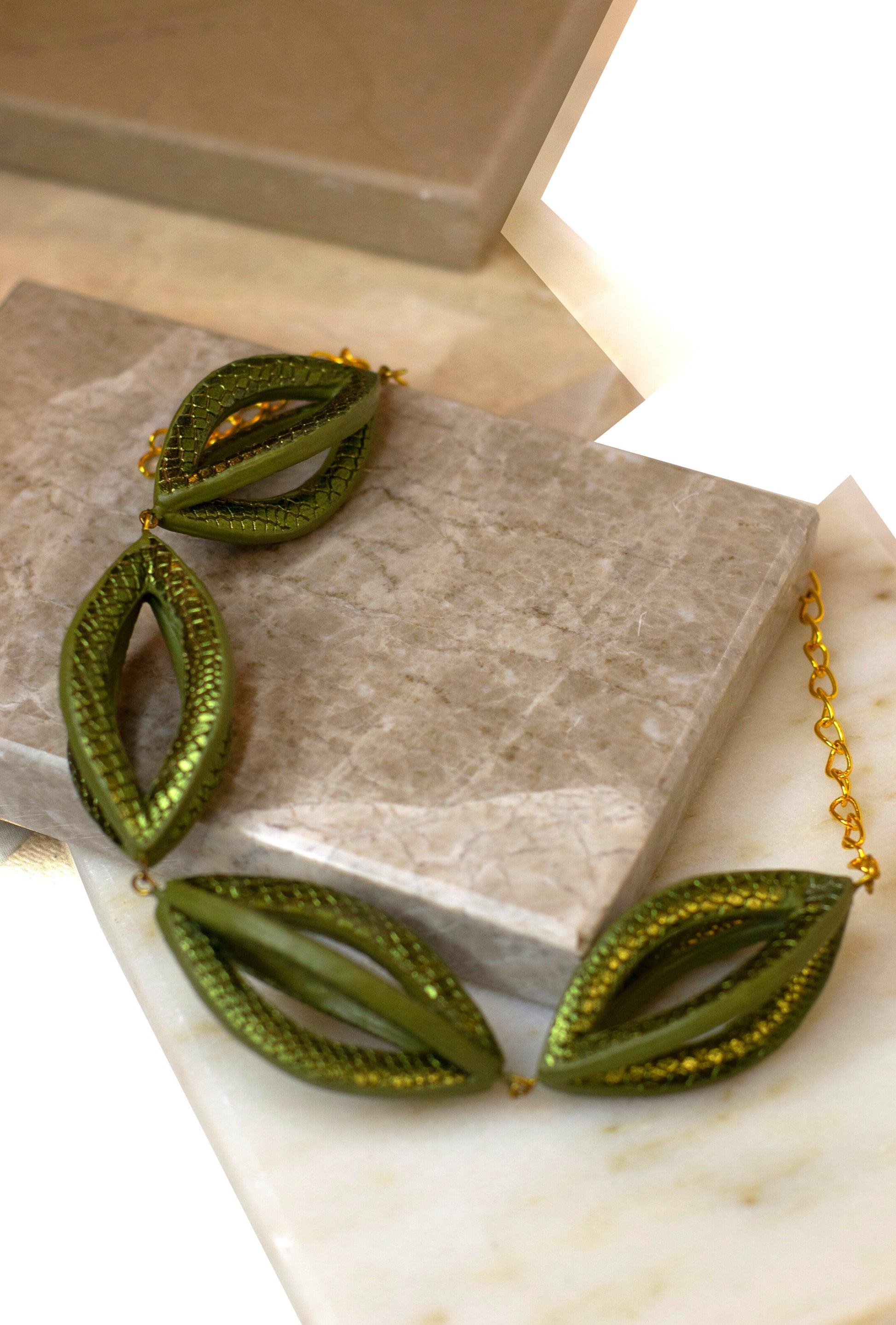 Metallic snake print leather, handcrafted into a prism like shape. The neckpiece is a statement, one of a kind piece.