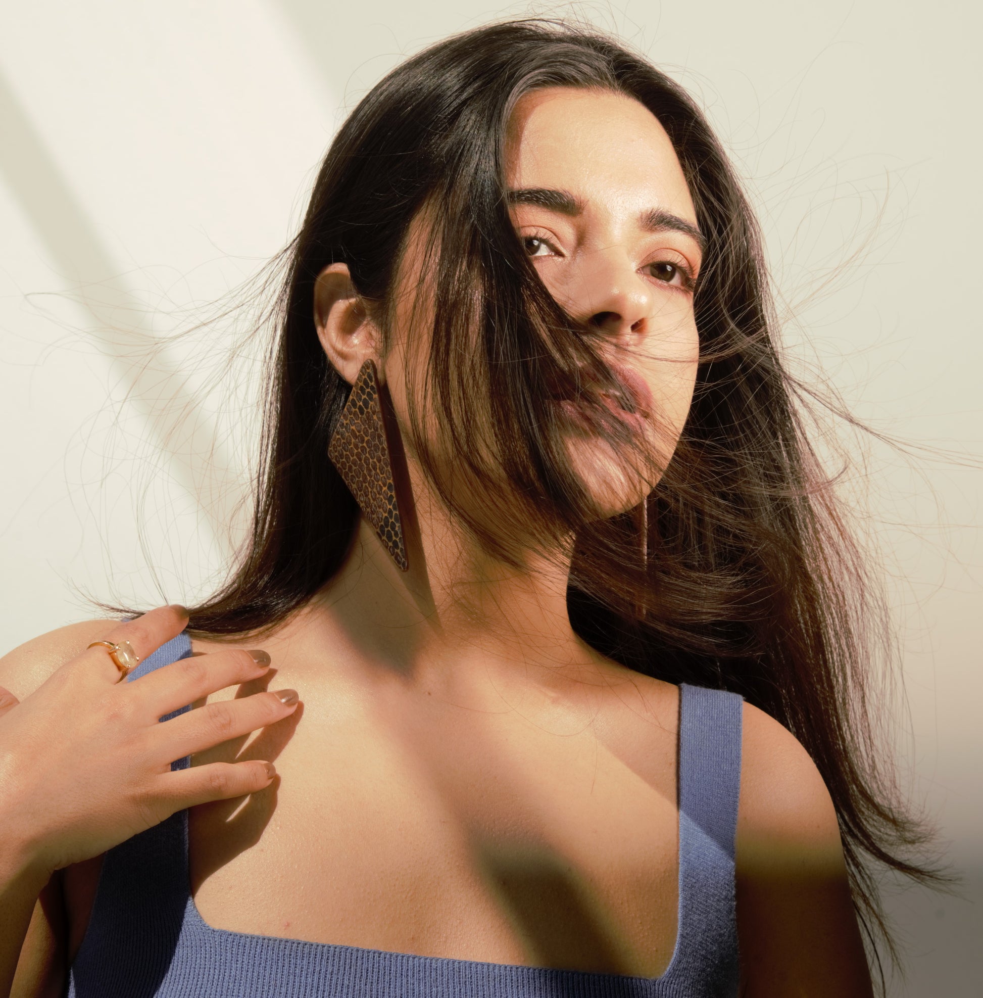 - The Scalene Earrings in Brown feature all angles and sides unequal, they have a scaly iridescent leather that reflects at an angle in a natural way.