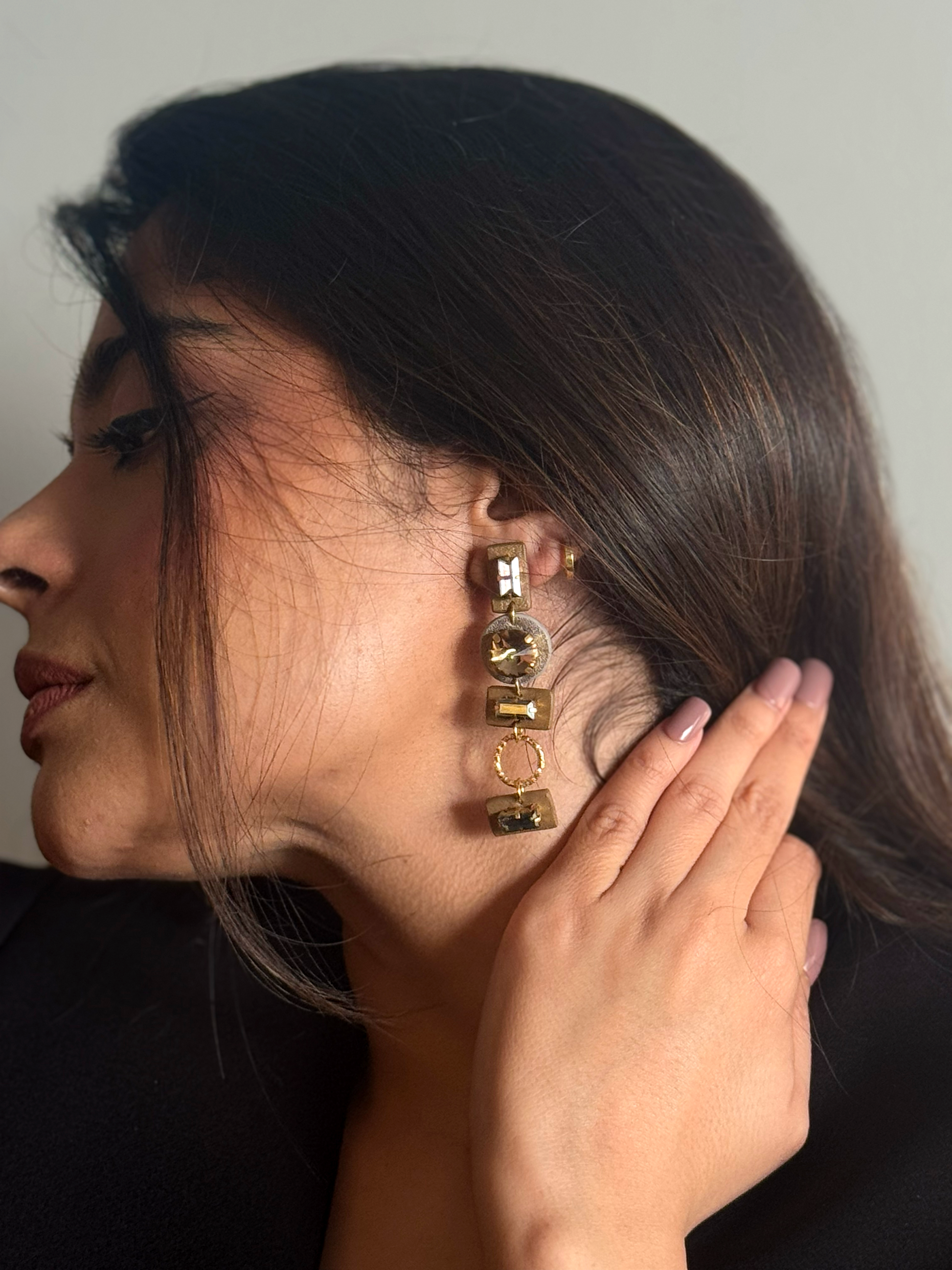 Indulge in luxury with our Stardust Danglers. These ethereal earrings feature a unique combination of silver and gold leather, adorned with stunning stones, placed asymmetrically for a one-of-a-kind look. Elevate any outfit with these exclusive statement pieces.