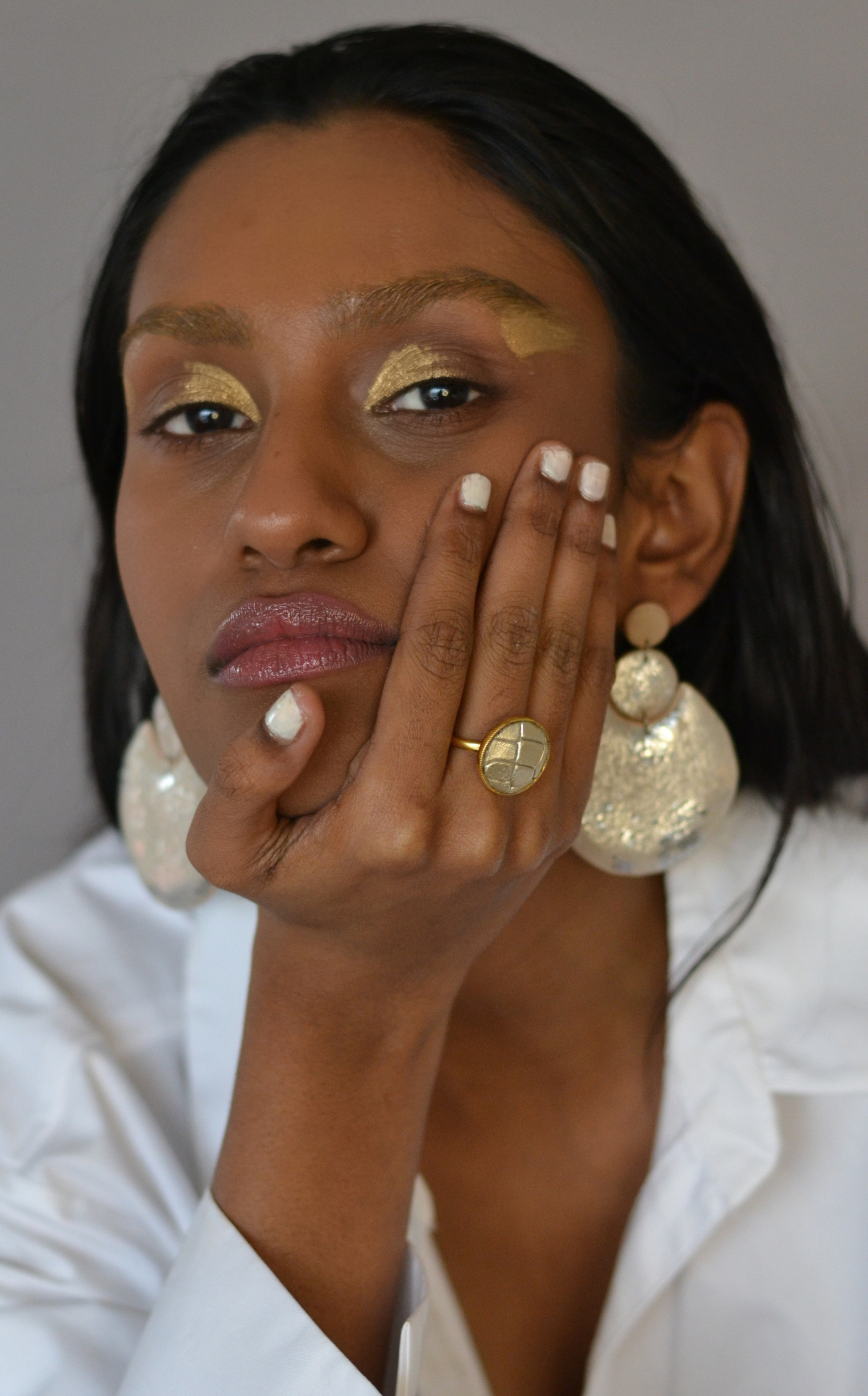 - The dome shaped leather sequin in a champagne gold colour & leather is fitted in a gold plated brass ring base.