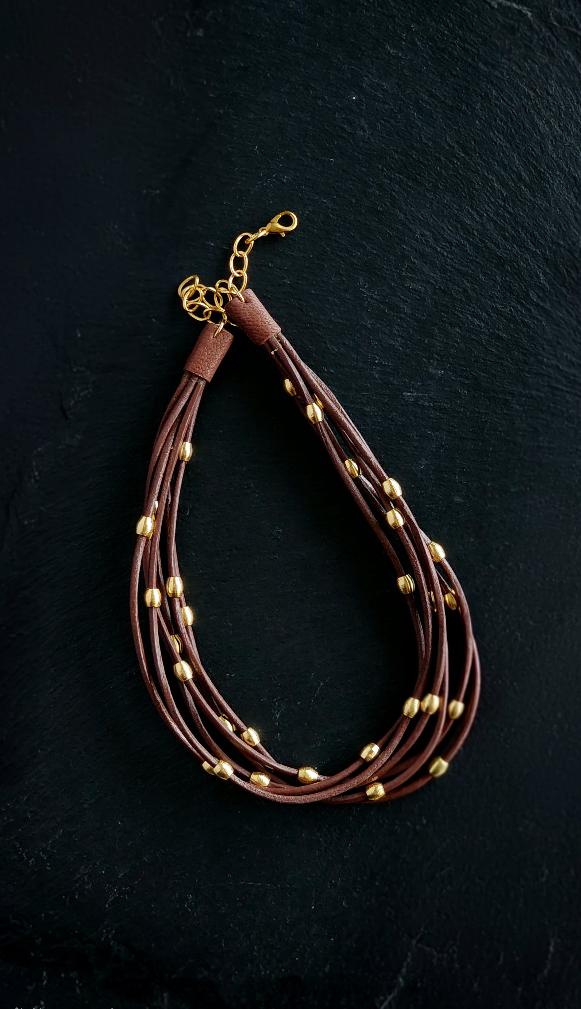- Luxurious silver leather strings adorned with opulent gold beads, intricately woven in an asymmetrical pattern reminiscent of celestial stars orbiting around their eternal paths. Enhance the elegance of your style with these stunning neckpiece, and elevate your outfit into a work of art.