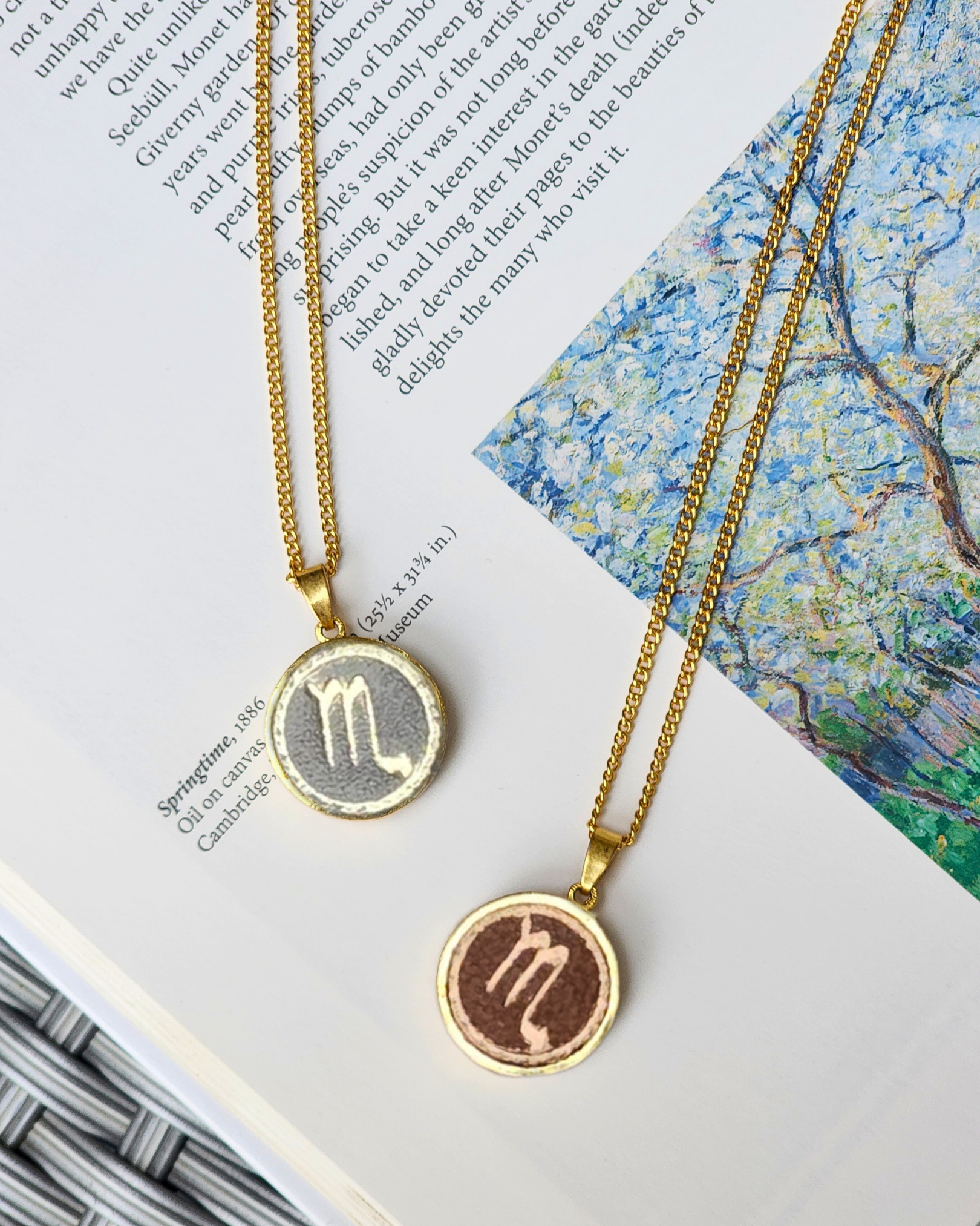 These expertly crafted Scorpio zodiac necklaces are perfect for those born under the passionate and mysterious Scorpio sign, embodying their intensity, determination, and deep emotional depth. Each pendant features a gold-plated brass medallion with an embossed leather insert, showcasing the Scorpio symbol in a design that reflects the sign’s transformative and powerful nature.