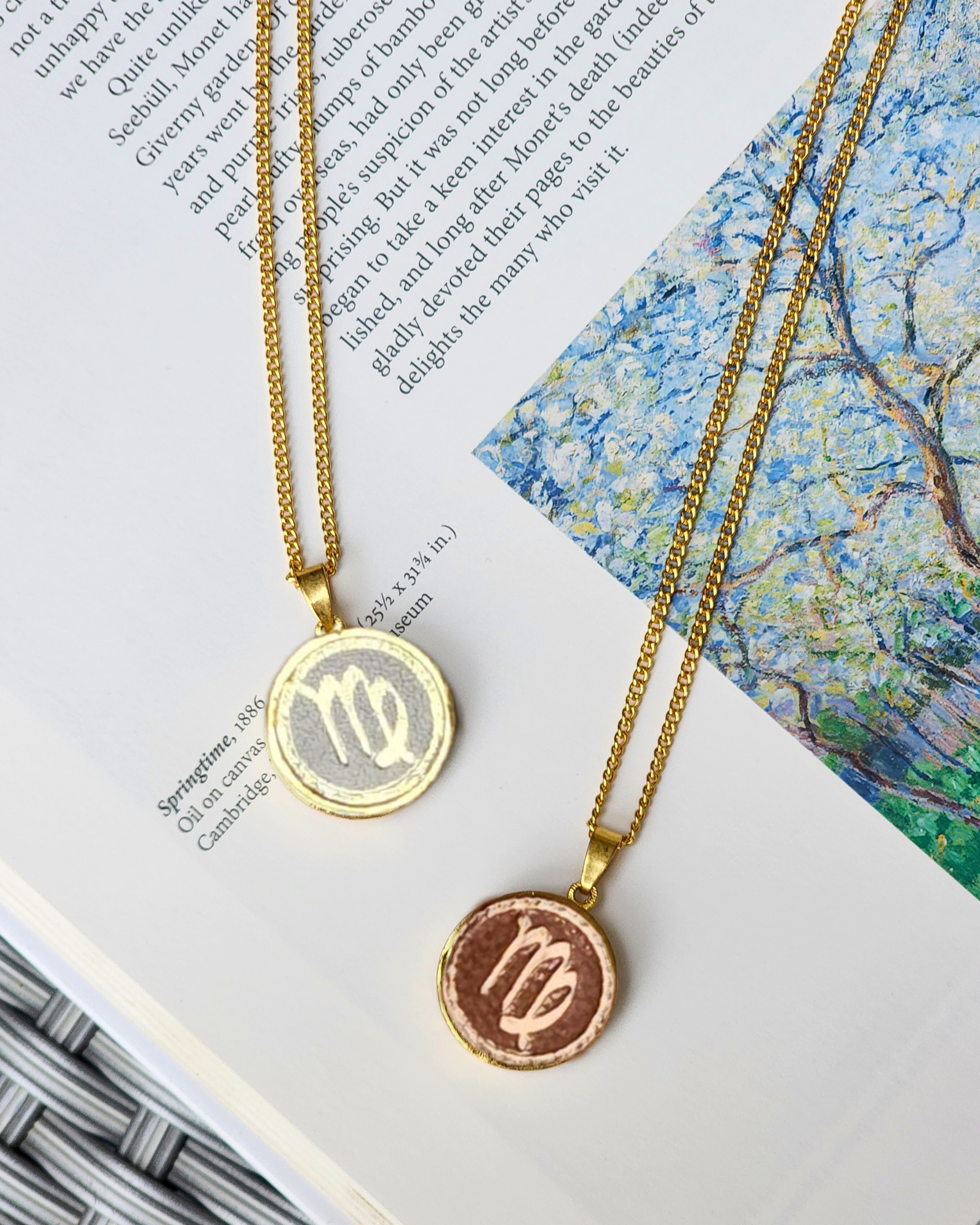 these elegantly crafted Virgo zodiac necklaces are perfect for those born under the practical and thoughtful Virgo sign, reflecting their analytical nature, attention to detail, and love for precision. Each pendant features a gold-plated brass medallion with an embossed leather insert, showcasing the Virgo symbol in a design that embodies the sign’s grounded and discerning qualities.